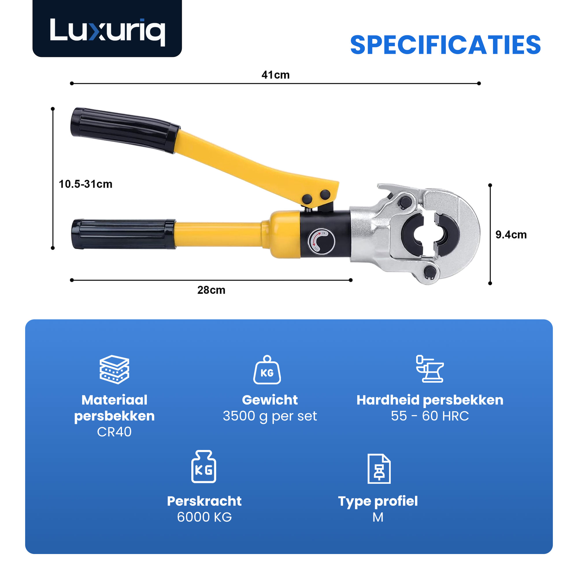 De Luxuriq® Perstang M Set biedt alles wat je nodig hebt voor professionele en duurzame persverbindingen. Met een 6000 kg hydraulisch systeem, een 360° draaibare kop en vijf geharde M-profielen (M12 t/m M28) werk je snel en efficiënt – zelfs op lastig bereikbare plekken. Compatibel met topmerken als Geberit Mapress, Bonfix en VSH XPress. De ideale keuze voor installateurs én doe-het-zelvers die geen concessies willen doen aan kwaliteit.