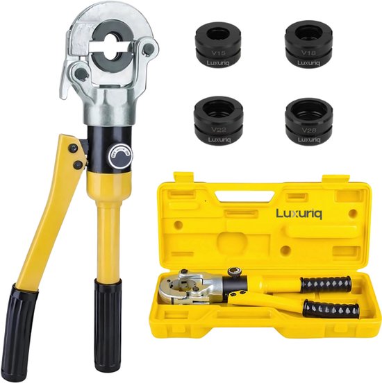 De Luxuriq® Perstang V Set is een krachtige hydraulische perstang voor V-profiel fittingen. Met 6000 kg perskracht, draaibare bekken en vier geharde V-profielen (V15 t/m V28) werk je snel en nauwkeurig aan stalen en koperen leidingen. Compatibel met Viega Profipress en meer. Ideaal voor installateurs en veeleisende klussers.