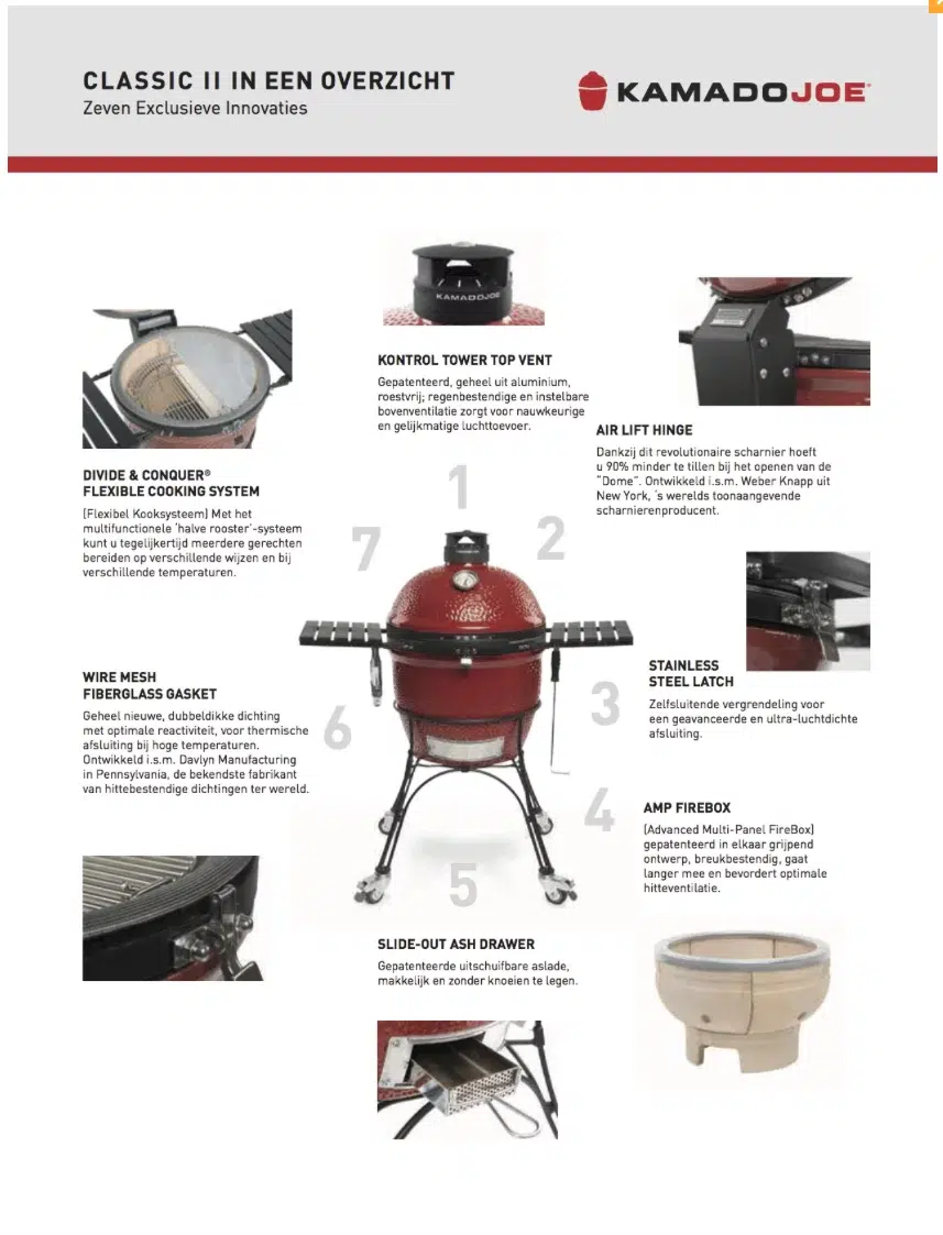 Of je nu een gepassioneerde thuiskok bent, of een beginnende BBQ’er die op zoek is naar kwaliteit, de Kamado Joe Classic 2 levert consistente resultaten, dag in dag uit. Dit is een kamado waar je jarenlang op kunt bouwen – en genieten.