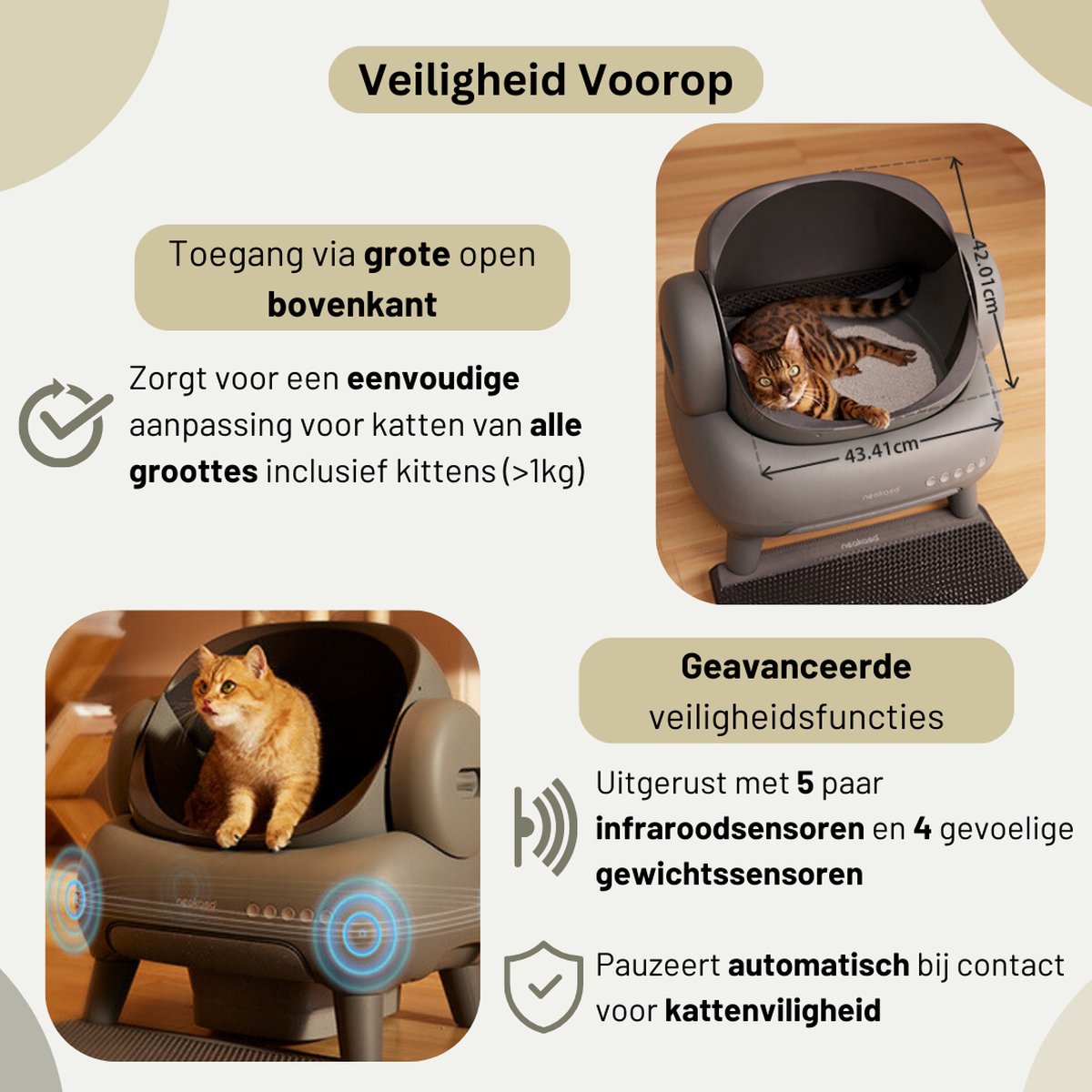 Ja, de Neakasa M1 beschikt over 5 infrarood- en 4 gewichtssensoren die detecteren wanneer je kat aanwezig is. De schoonmaakcyclus pauzeert automatisch als je kat in de buurt is.