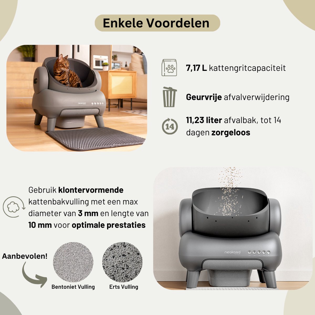 De grote afvalbak (11,23 liter) biedt ruimte voor tot wel 14 dagen afvalopvang, waardoor je slechts om de week hoeft te legen. In combinatie met de intelligente afdichttechniek en geurcontrole blijft de bak fris, schoon en geurvrij. De meegeleverde kattenbakmat vangt los grit op en voorkomt verspreiding in huis.
