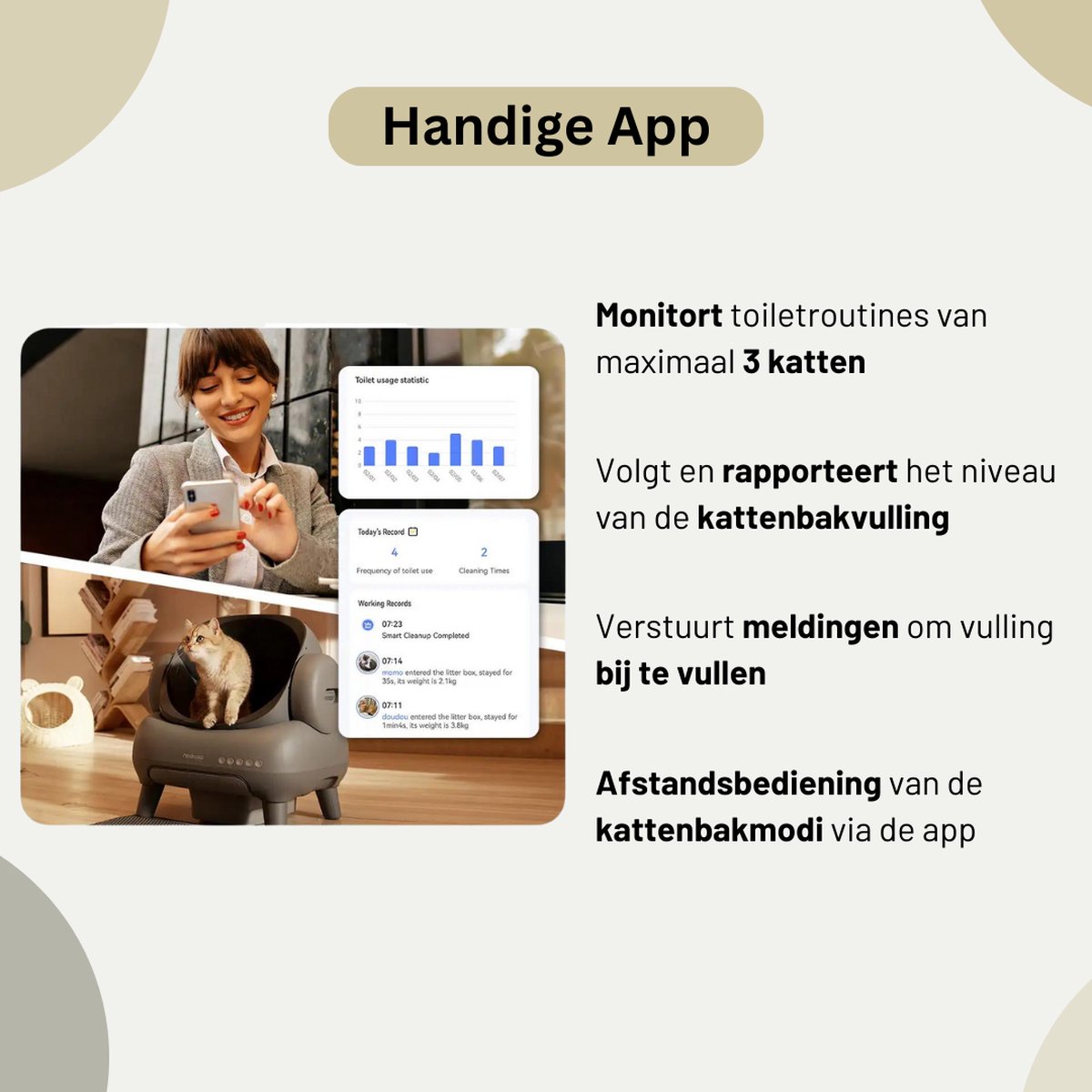 Met de app kun je de kattenbak op afstand bedienen, het gebruik monitoren, meldingen ontvangen en instellingen aanpassen. Je kunt tot drie katten volgen, inclusief hun gewoontes en activiteit.