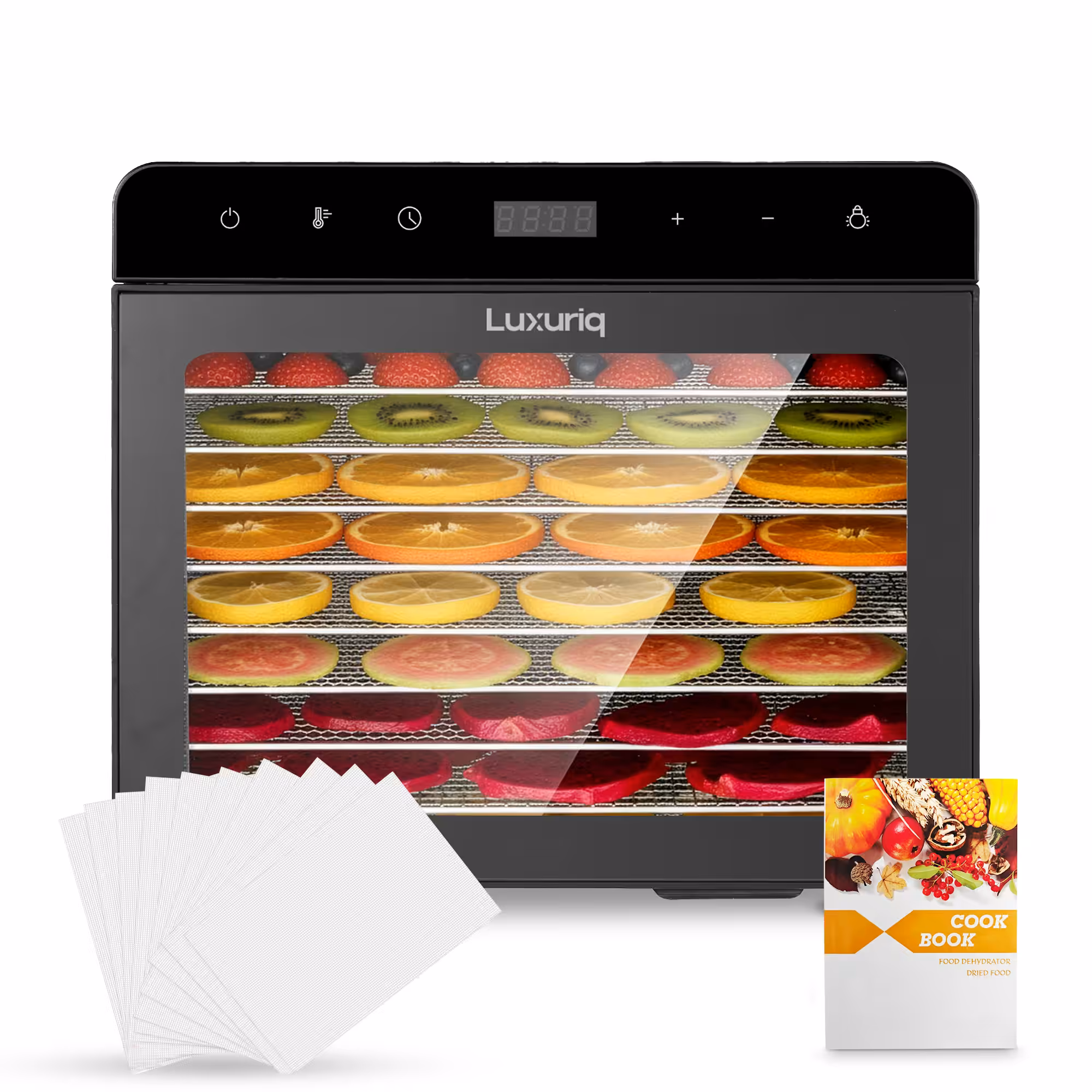 De Luxuriq Voedseldroger maakt gezonde snacks thuis eenvoudig. Met 8 RVS-droogrekken, 30–85°C en 360° luchtcirculatie droog je fruit, groenten, vlees en kruiden gelijkmatig. Stil, met LED-touchbediening en inclusief receptenboekje.